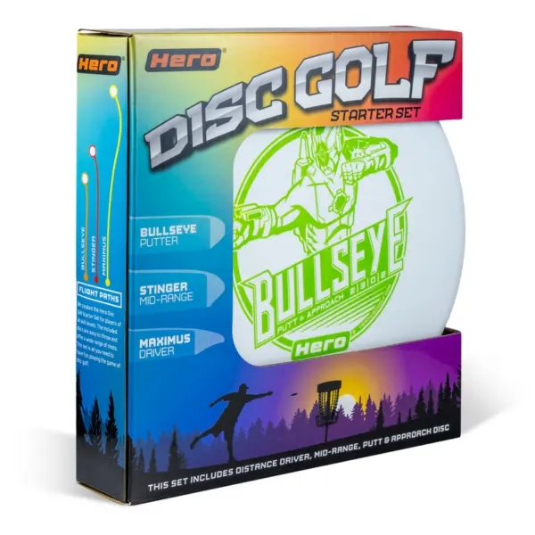 Disc golf startersettet fra Hero Disc inkluderer en driver, en mid range og en putter. Dette komplette settet er perfekt for nybegynnere og inneholder alle discene du trenger for å komme i gang. Kvaliteten er sertifisert og godkjent av Professional Disc Golf Association (PDGA).
